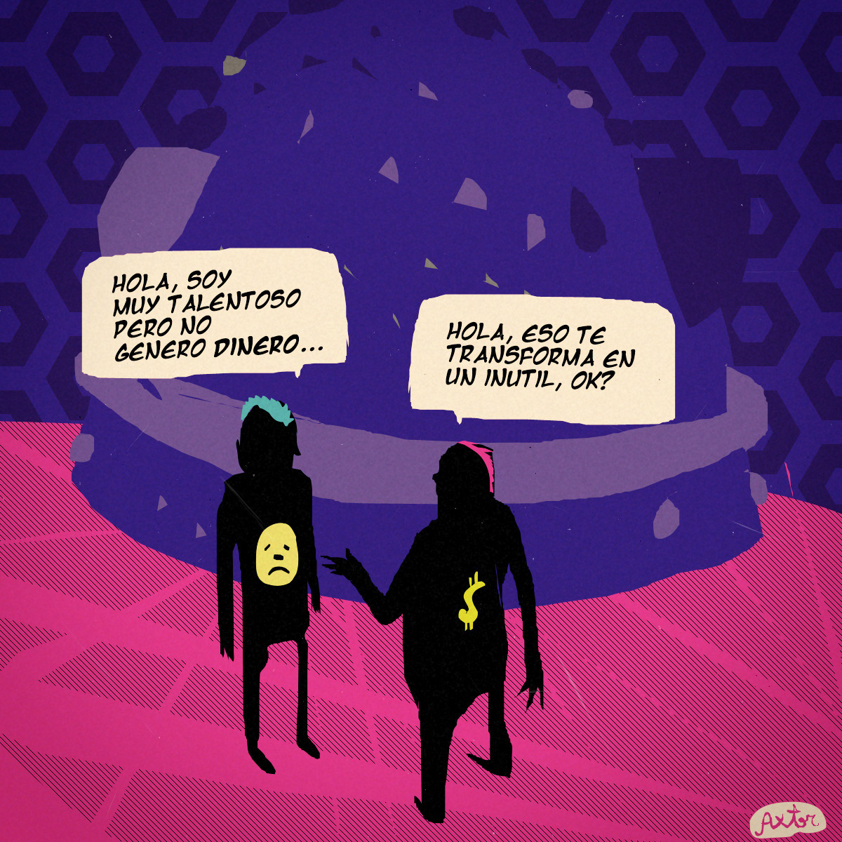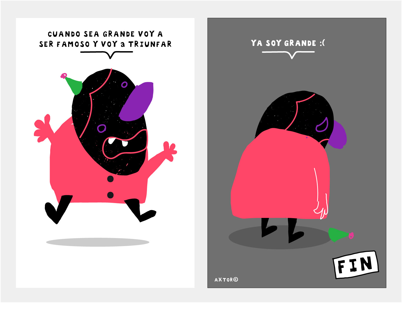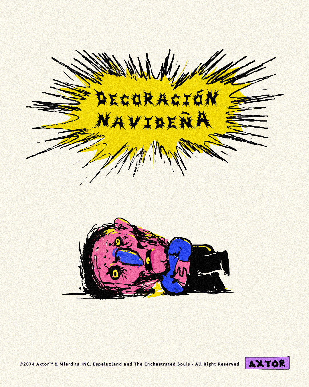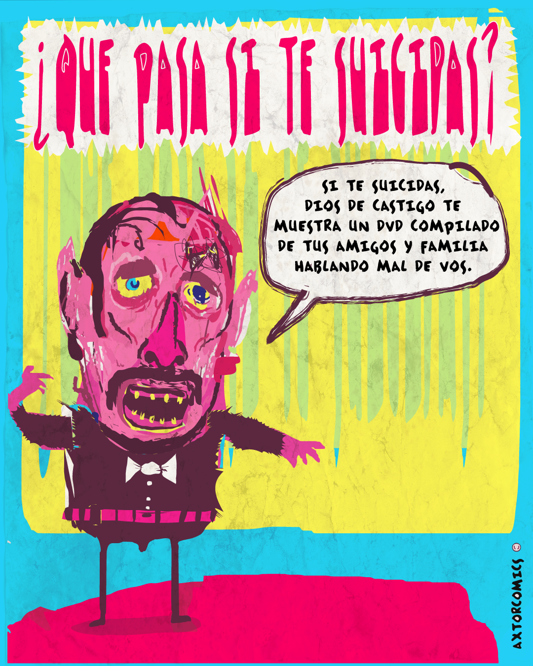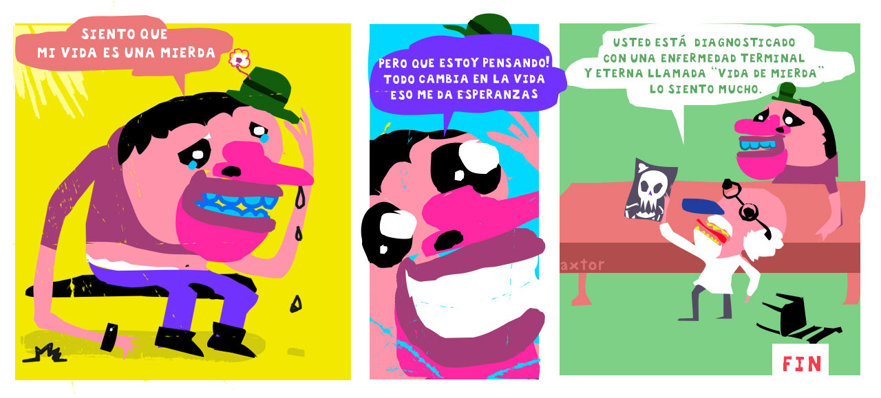 This is experimental graphic humor because the formula is always changing while keeping a raw and colorful essence that connects all the pieces through themes, emotions and psychological aspects. The works combine the absurd, the critical and the paradoxical sides of life. Each piece explores curious visual codes with strong graphic design presence and narratives that range from surreal to deeply reflective. Axtorcomics aims to bring art closer to graphic humor blurring the lines between them and creating a unique visual language without limitations.