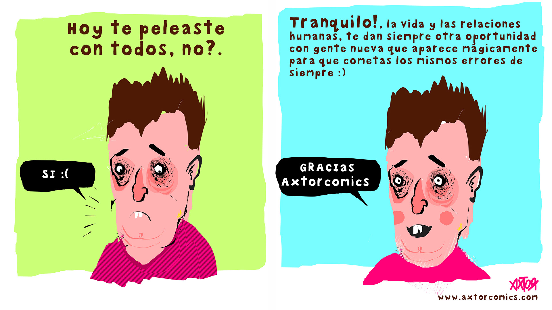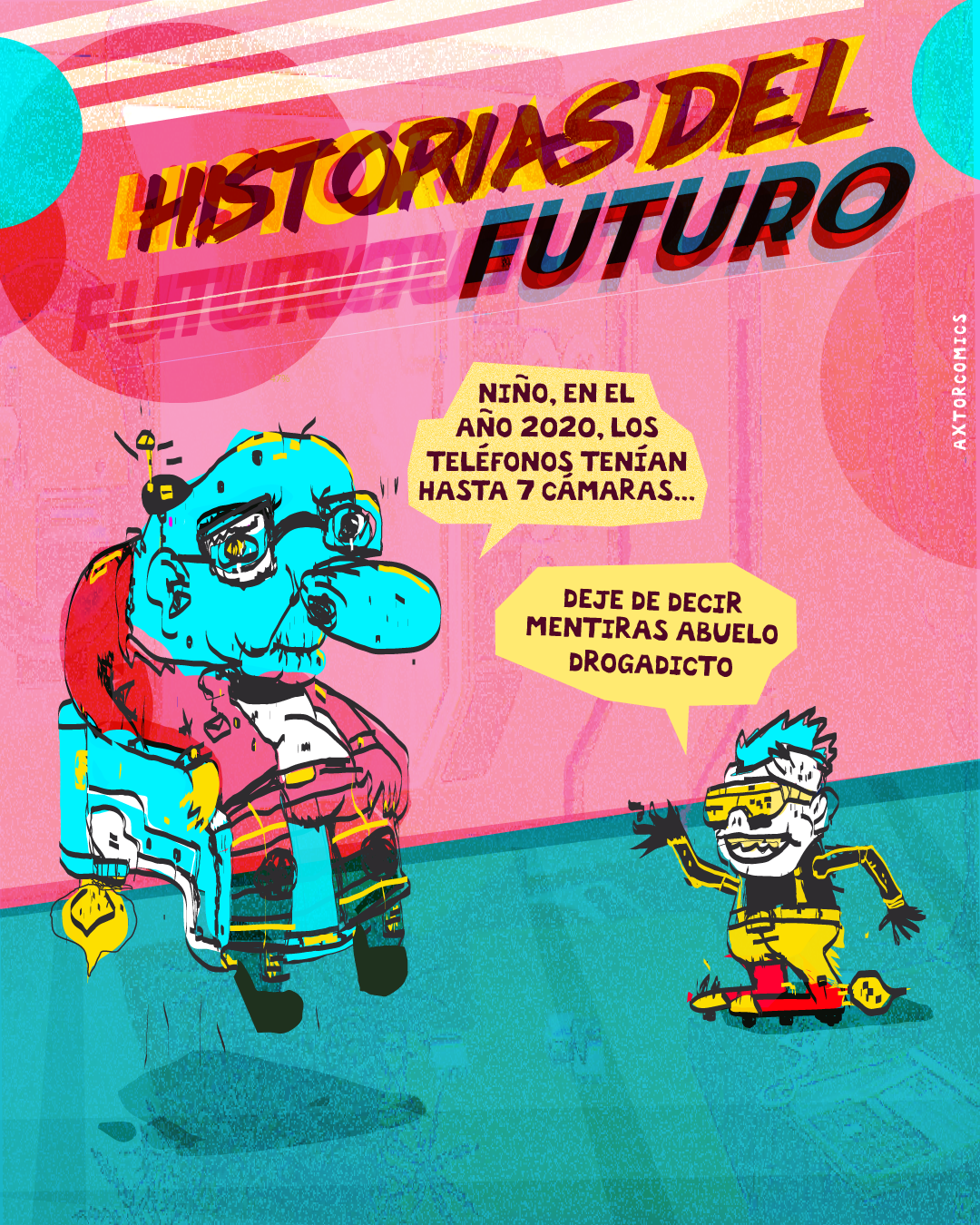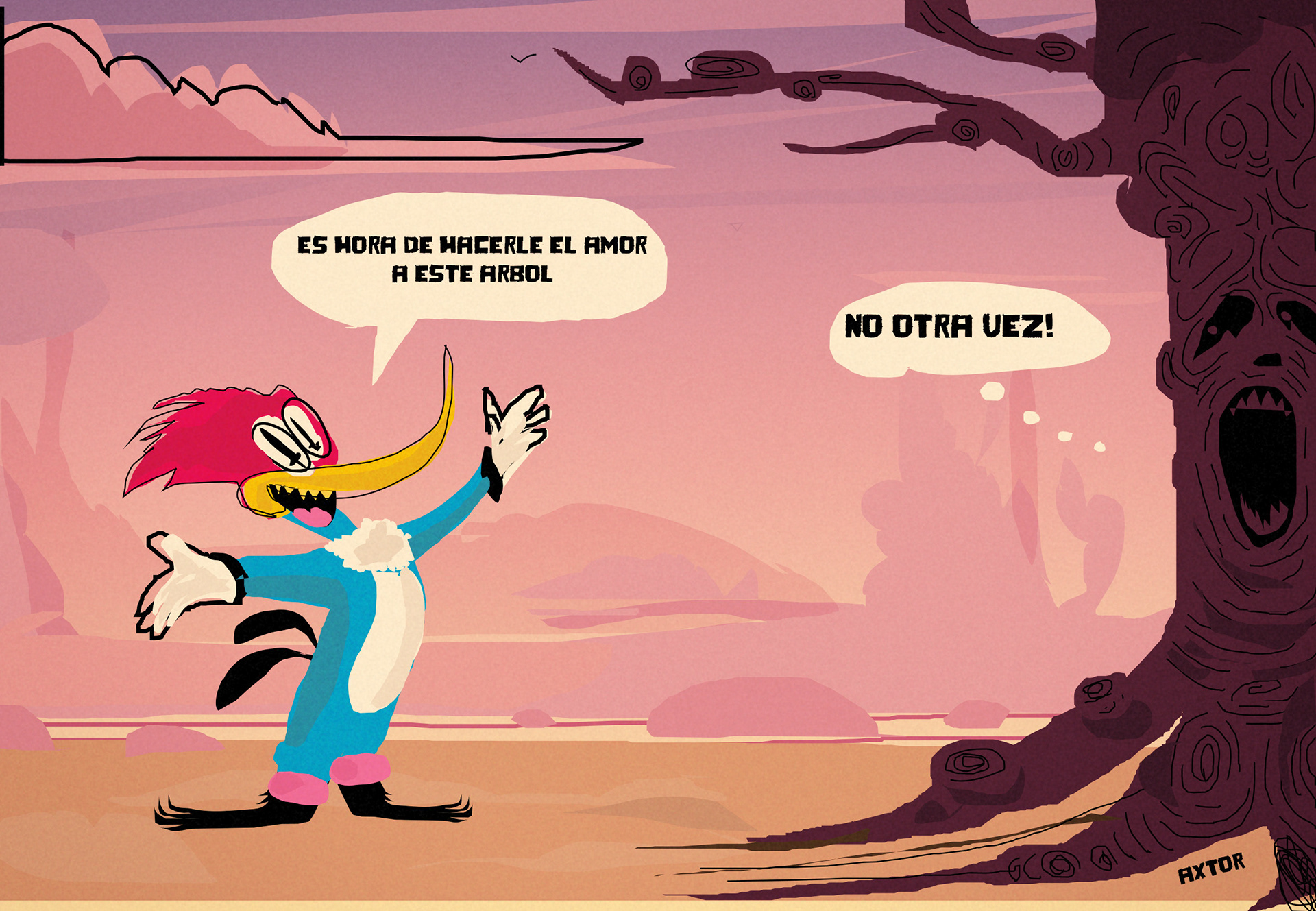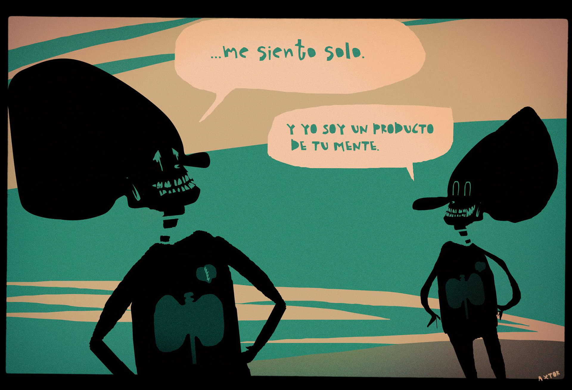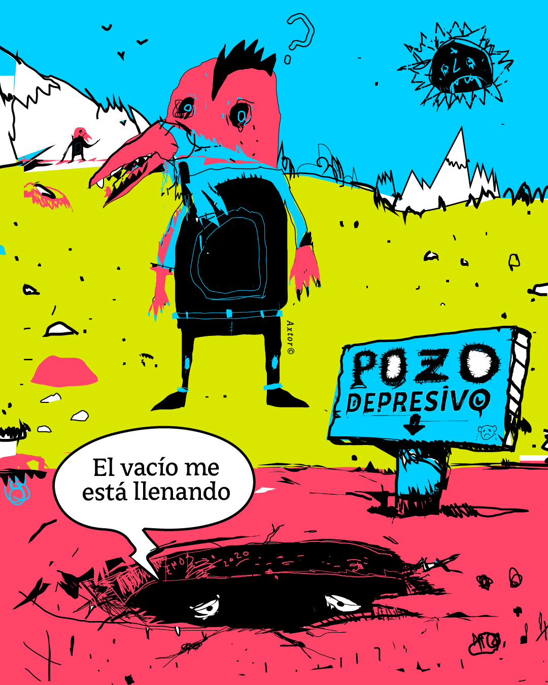 This is experimental graphic humor because the formula is always changing while keeping a raw and colorful essence that connects all the pieces through themes, emotions and psychological aspects. The works combine the absurd, the critical and the paradoxical sides of life. Each piece explores curious visual codes with strong graphic design presence and narratives that range from surreal to deeply reflective. Axtorcomics aims to bring art closer to graphic humor blurring the lines between them and creating a unique visual language without limitations.