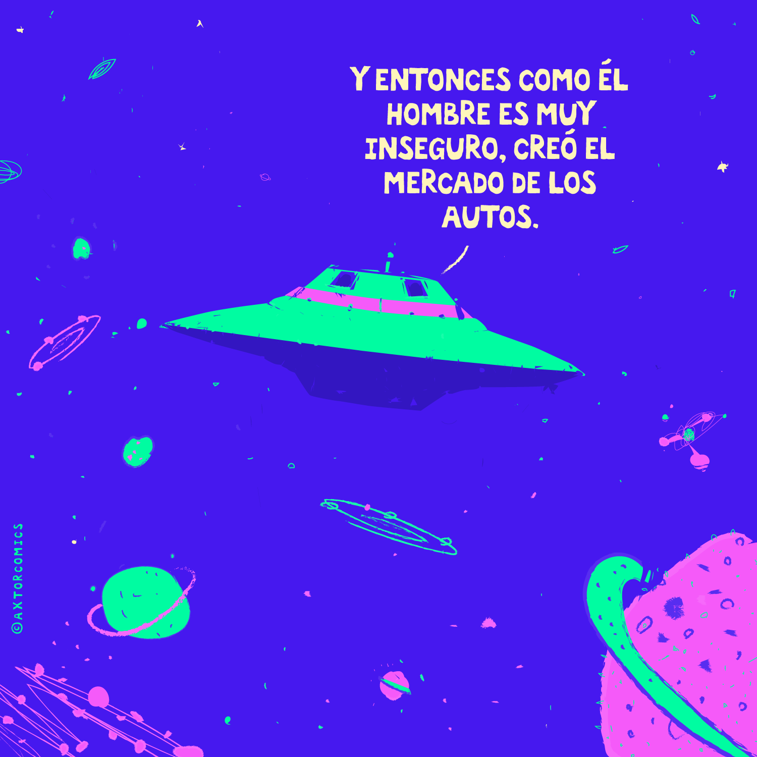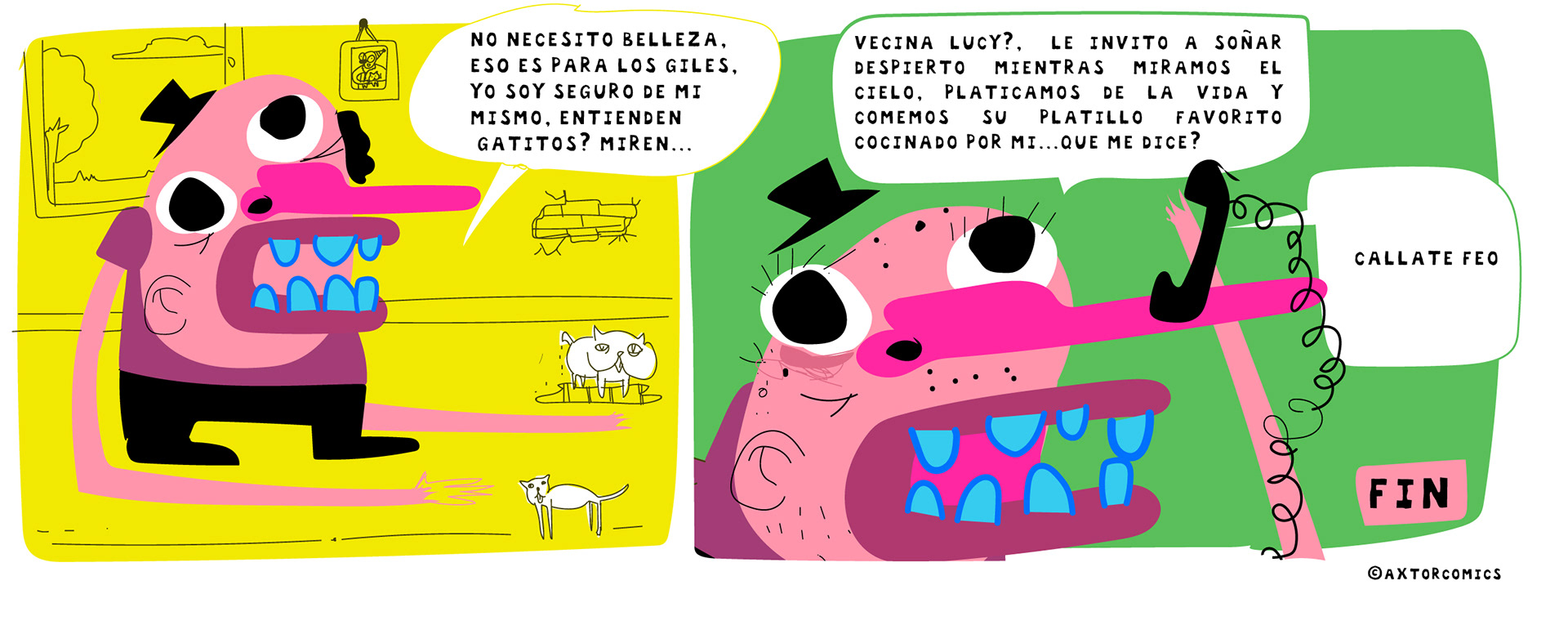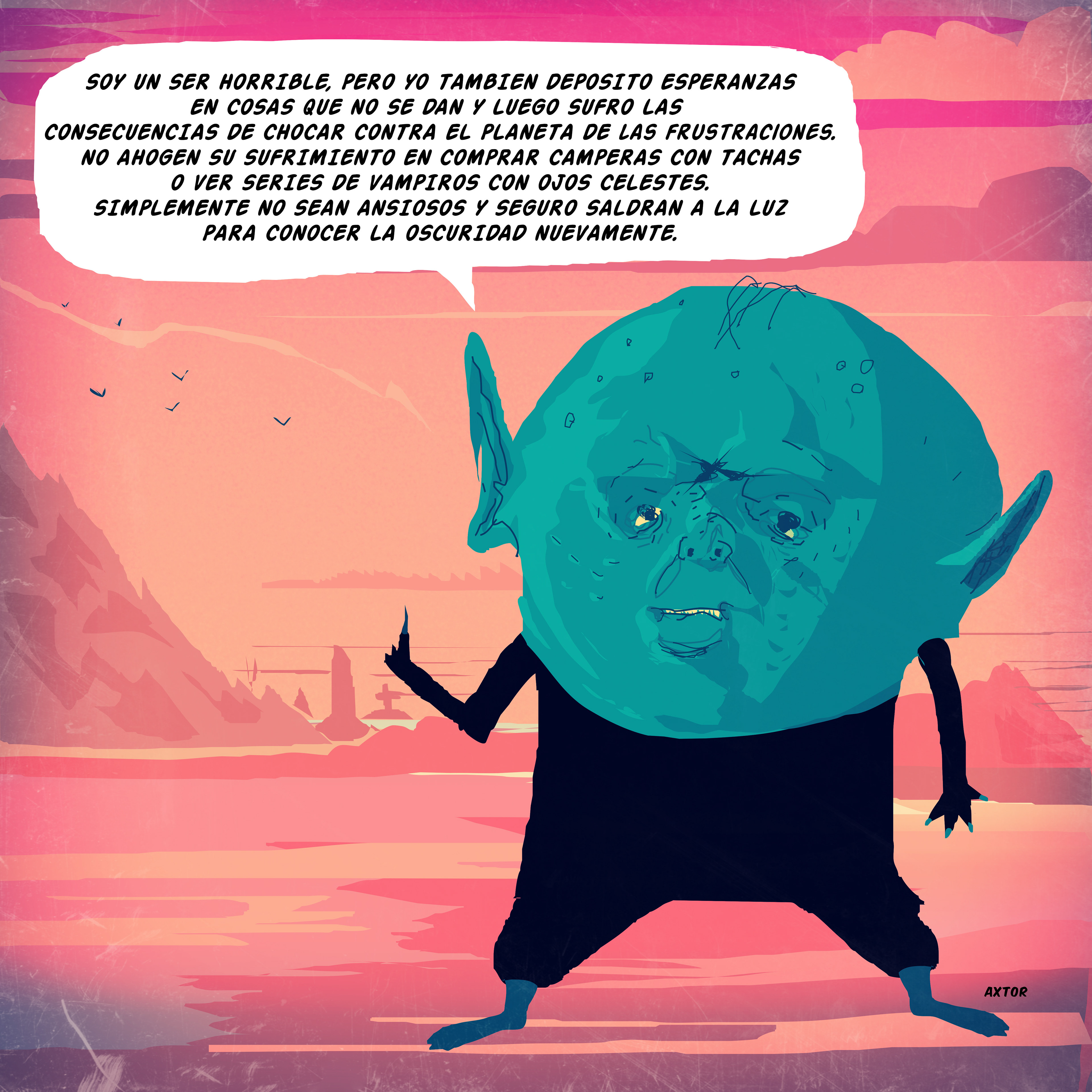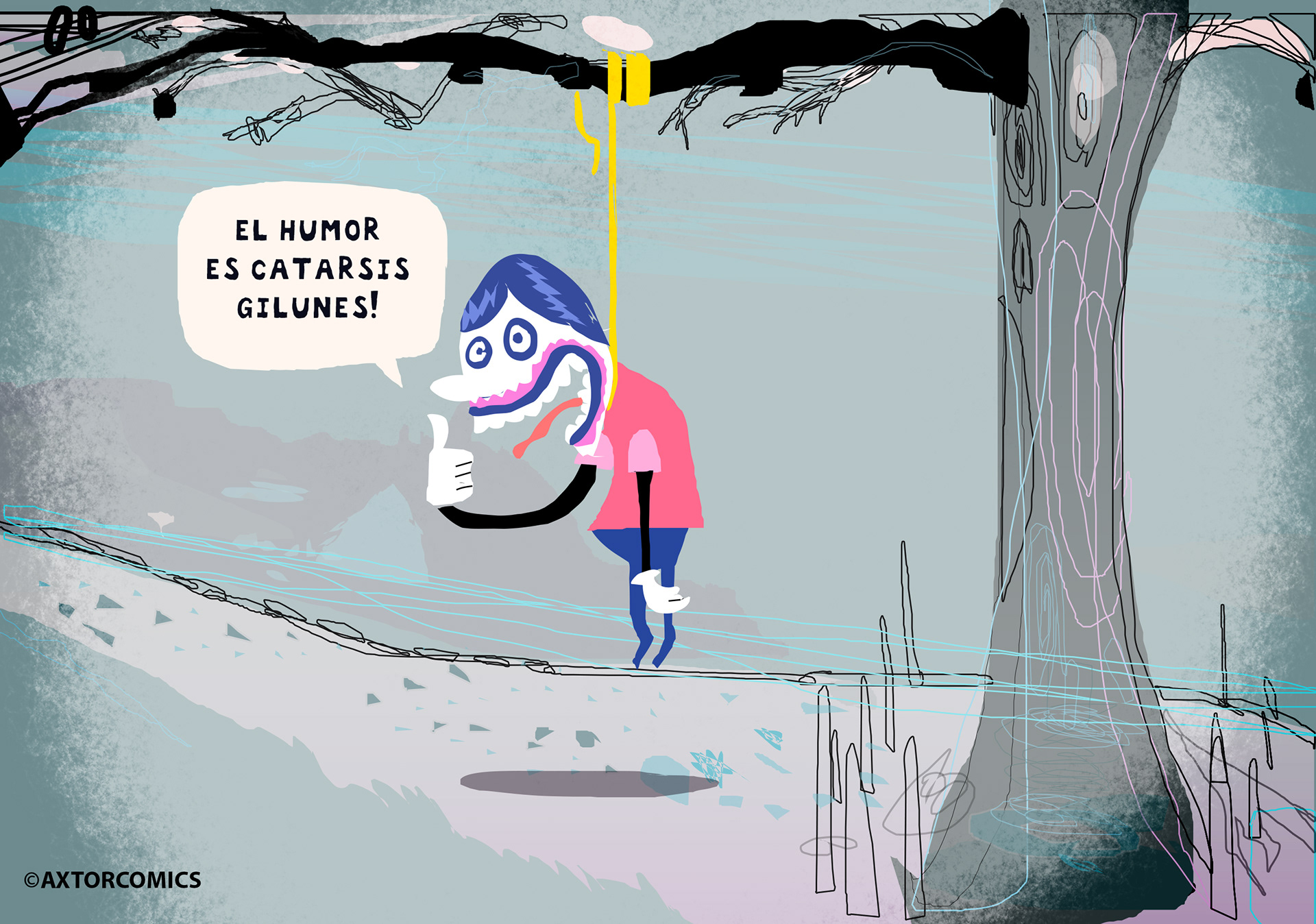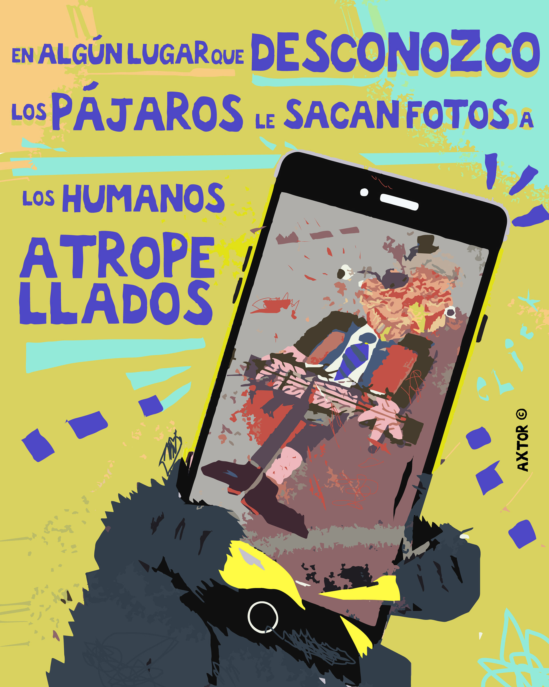 This is experimental graphic humor because the formula is always changing while keeping a raw and colorful essence that connects all the pieces through themes, emotions and psychological aspects. The works combine the absurd, the critical and the paradoxical sides of life. Each piece explores curious visual codes with strong graphic design presence and narratives that range from surreal to deeply reflective. Axtorcomics aims to bring art closer to graphic humor blurring the lines between them and creating a unique visual language without limitations.
